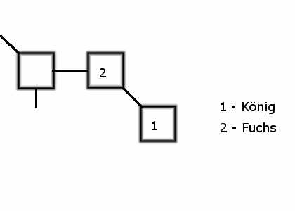 Nun gehen wir nach Nordwesten und stellen fest, dass der Raum, in dem wir landen, Ausgänge nach Westen und Suedosten hat - außerdem läuft hier ein Fuchs herum. Wir umranden also das Kästchen am Ende des Weges nach Nordwesten und zeichnen den neuen Weg ein: